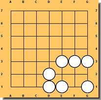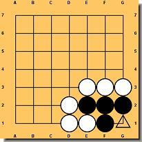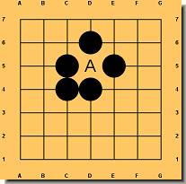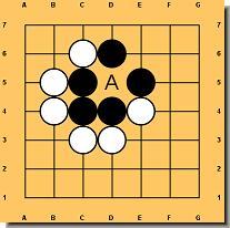 Jest jedna sytuacja, która wymaga specjalnej uwagi. Jeśli Biały zagra w punkt A na rysunku 13, to nie będzie miał ani jednego oddechu. Sam zbije swojego piona, taki ruch jest zabroniony. Samobójstwo to ruch, w którym sami zabieramy sobie ostatni oddech i jest on niedozwolony. Wyjątkiem od tej zasady jest ruch, który zbija jednocześnie piony przeciwnika (rysunek 14). W tym wypadku biały może zagrać w A gdyż zbija jednocześnie trzy czarne piony. Inny przykład przedstawia rysunek 15. Czarny ma tylko jeden oddech. Biały może zagrać tam i nie będzie to samobójstwo gdyż ruch ten zbija piony Czarnego. Rysunek 16 przedstawia sytuację po zbiciu i zdjęciu czterech pionów Czarnego.