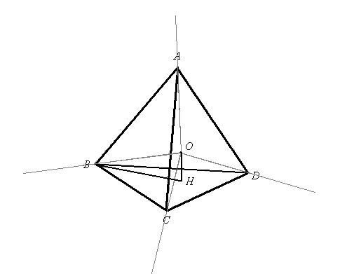 Środki A, B, C, D kul danych są wierzchołkami czworościanu foremnego o krawędzi 2r, gdzie r = 1. Niech O będzie środkiem kuli opisanej na czworościanie ABCD, a R promieniem tej kuli.