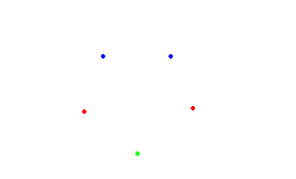 Liczba wierzchołków jest nieparzysta, więc do jednego z podzbiorów będą należały dwa kolejne wierzchołki. Niech to będą wierzchołki koloru niebieskiego. Jeśli do drugiego podzbioru będą należały wierzchołki koloru czerwonego, to pozostały (zielony)wierzchołek nie może należeć ani do zbioru pierwszego, ani do drugiego, gdyż z trzech wierzchołków powstanie trójkąt równoramienny.