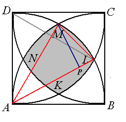Pole rozważanej figury równe jest sumie pola kwadratu o boku $ML$ i czterech pól odcinków kół opartych na cięciwach $ML, MN, NK, KL$.