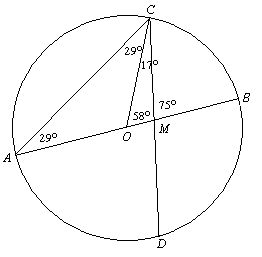 Kąt BAC jest kątem wpisanym opartym na łuku BC. Jego miara równa jest więc 29°. Kąt BMC jest kątem zewnętrznym w trójkącie MCO, czyli jest równy sumie kątów MOC i OCM. Stąd miara kąta OCM wynosi 17°. Miara poszukiwanego kąta ACD równa jest 29° + 17° = 46°.