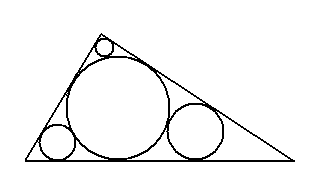 Zadanie 212 Rozwiązanie W trójkąt wpisano okrąg oraz trzy mniejsze okręgi w taki sposób, że każdy z pozostałych okręgów jest styczny do okręgu największego i do dwóch boków trójkąta. Długości promieni czterech okręgów są czterema różnymi liczbami całkowitymi. Jaki jest możliwie najmniejszy promień okręgu największego?